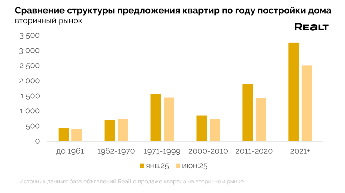 Больше всего сузилось предложение в современных домах - моложе 2000 г.п., что наглядно демонстрирует покупательские предпочтения. Подобные дома выступают отличной альтернативой подорожавшим новостройкам от застройщиков, за счет сочетания более доступной стоимости, все еще молодого возраста, наличия “здесь и сейчас” и современного стилистического оформления.