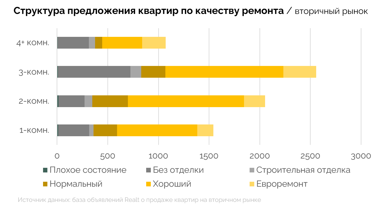 квартиры с пометкой “плохое состояние”, +20%, но в натуральном выражении это всего лишь +7 квартир. Это сегмент самый малочисленный на рынке.