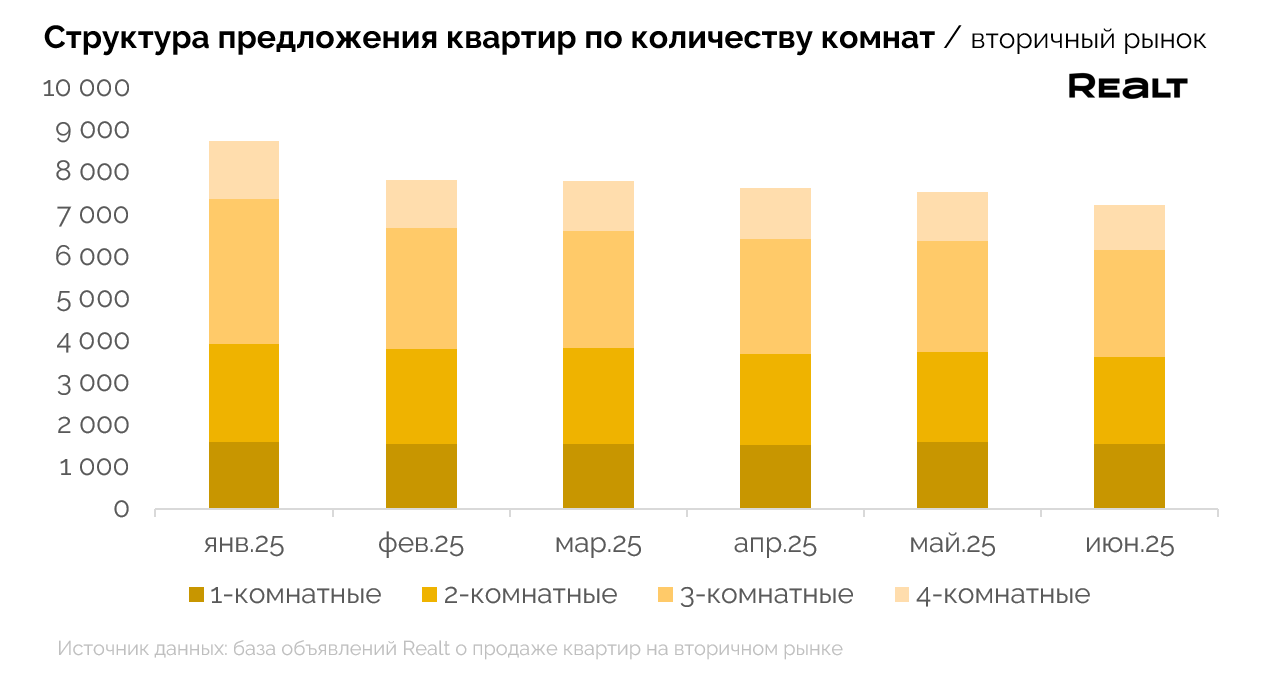 Несмотря на то, что однокомнатные квартиры на первых местах покупательских предпочтений и лидеров продаж, их количество в предложениях от продавцов уменьшилось за 2025 год меньше всего - на -3%.