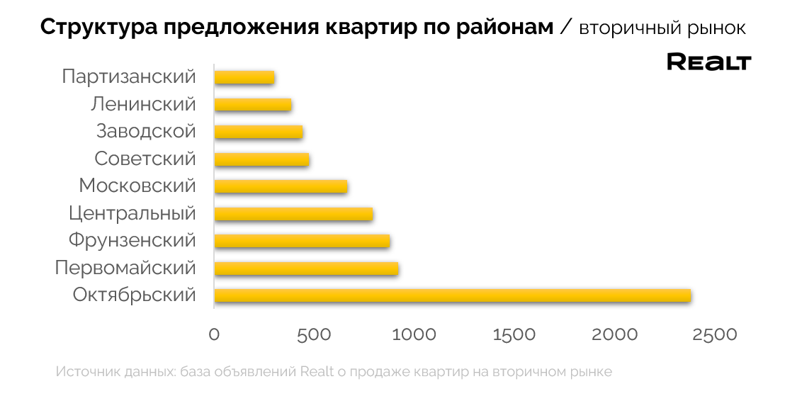 На сегодняшний день лидером по количеству предлагаемых на продажу квартир является Октябрьский район с более чем 2,3 тыс. квартир (во многом за счет “Минск-Мира”).