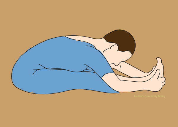 Встань на колени, расставь их на ширине плеч, руки держи позади туловища. Медленно наклоняйся вперед, опусти голову вниз полностью. В такой расслабленной позе проведи 3–4 минуты с перерывами, дыши глубоко и ровно, почувствуй, как спина отдыхает.