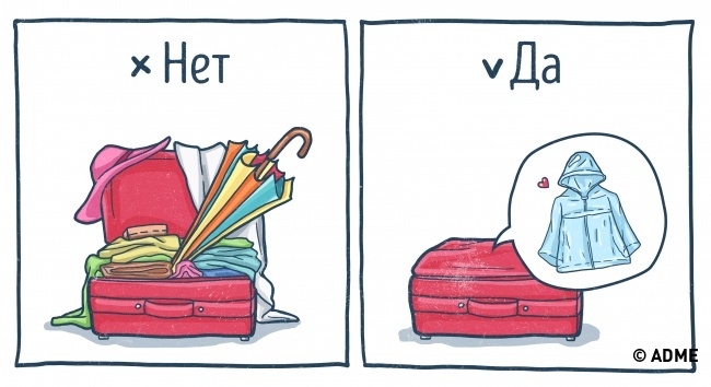 Не тащим в отпуск любимый зонт-трость и делаем выбор в пользу дождевика, который займет в чемодане минимум места. Можно купить даже несколько одноразовых плащей для путешествия и просто выбрасывать их после дождя.