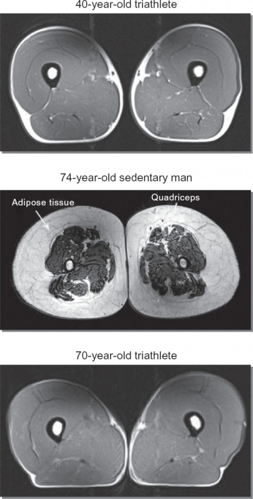 Для начала посмотрите, как выглядит в разрезе (на МРТ) нога 40-летнего триатлета, 74-летнего обычного человека и — в самом низу — 74-летнего триатлета: