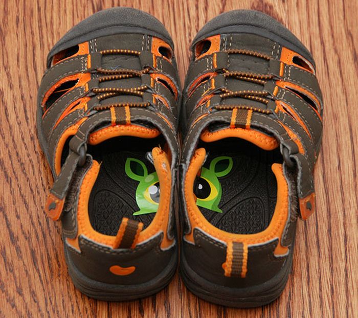 Если ребёнок путает ботиночки, то можно приклеить на стельку разрезанную пополам наклейку