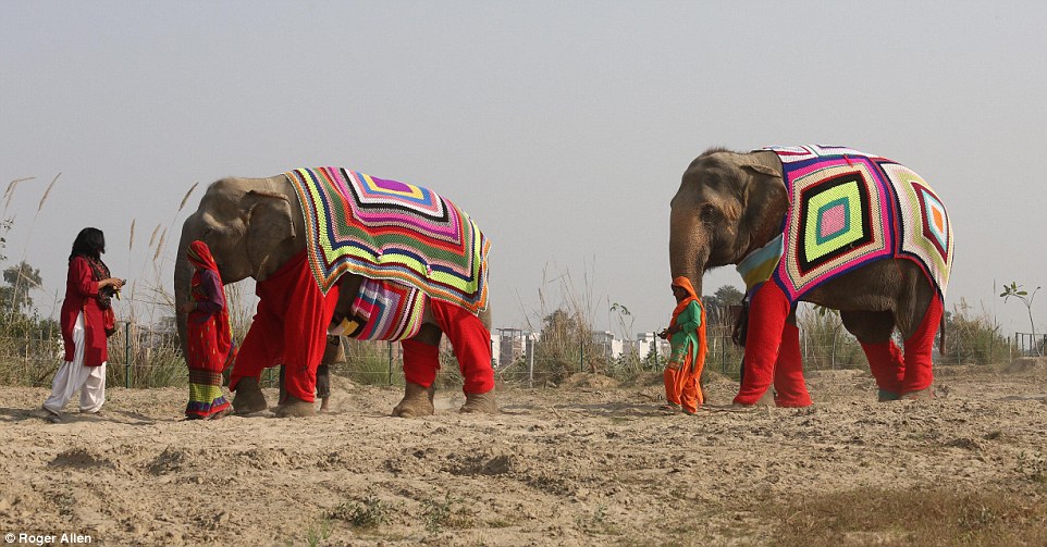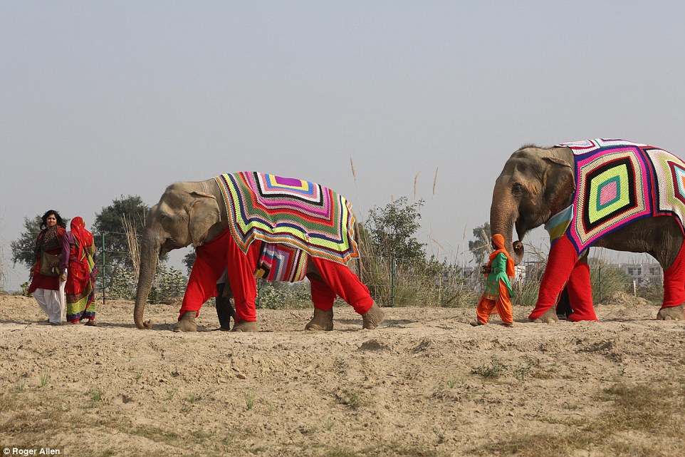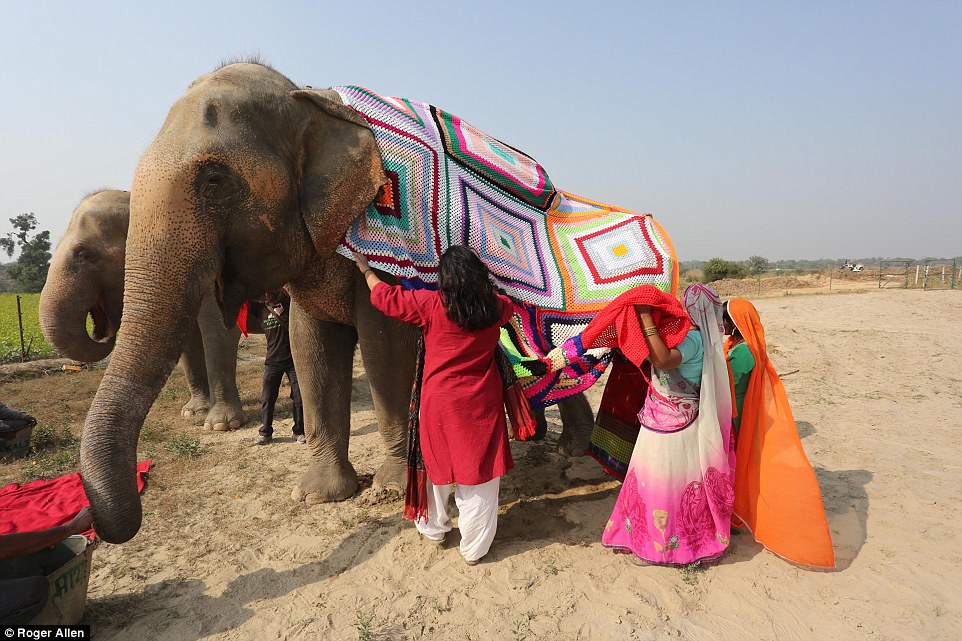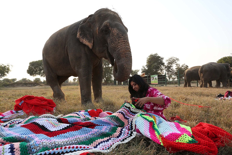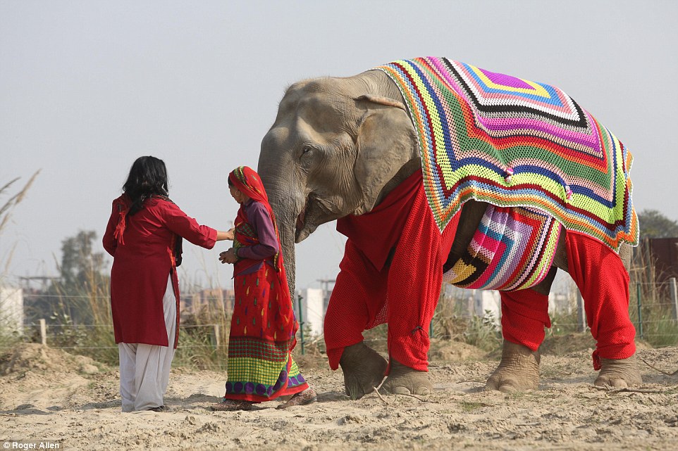 Индианки вяжут слонам пижамы, чтобы бедняжки не мёрзли в холода