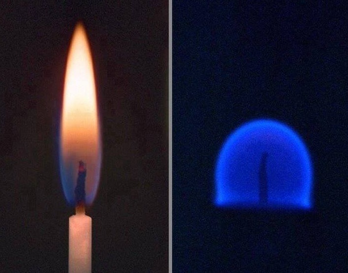 - Слева — горение свечи в атмосфере Земли, а справа — в невесомости: