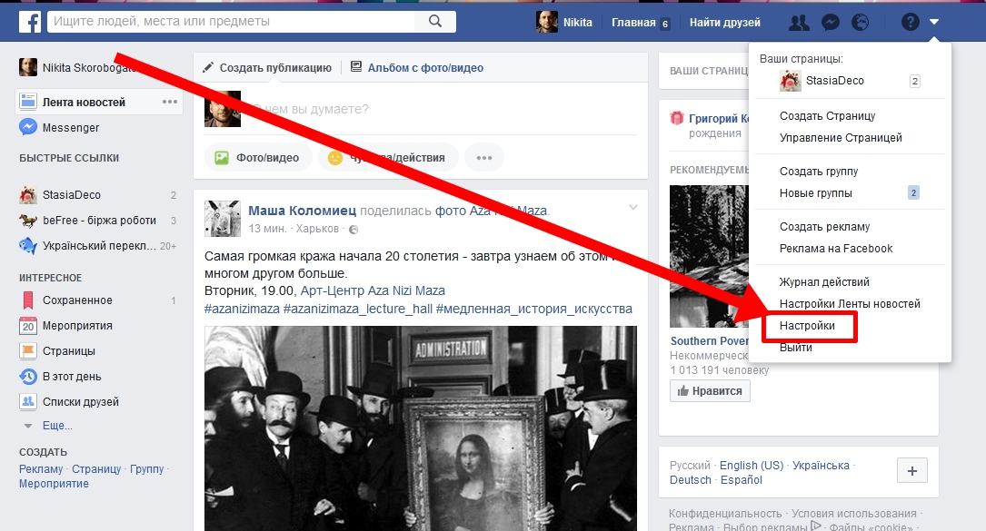 1. Зайдите на свою страницу и нажмите на стрелочку в верхнем правом углу