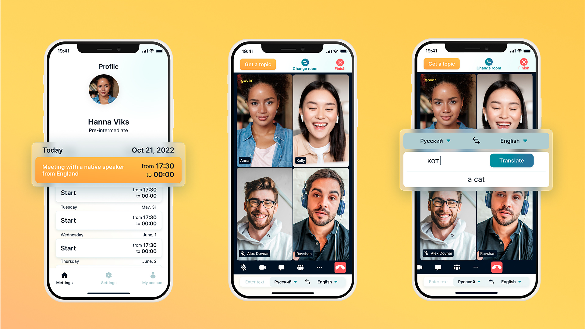 Сначала созвоны были 3 раза в неделю, постепенно расширились до 5, а к началу лета 2022 года дошли до 7 дней. Со стороны пользователя работа в приложении выглядит так: заходишь, выбираешь встречу и уровень английского, попадаешь в групповой видеозвонок. Если человек не знает своего уровня, то может пройти тест.